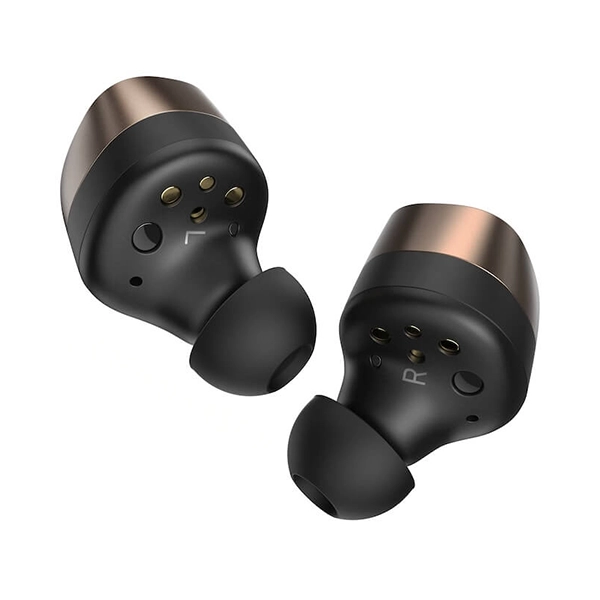 • Design: Premium in-ear wireless earbuds with copper metallic accents and fabric-covered charging case